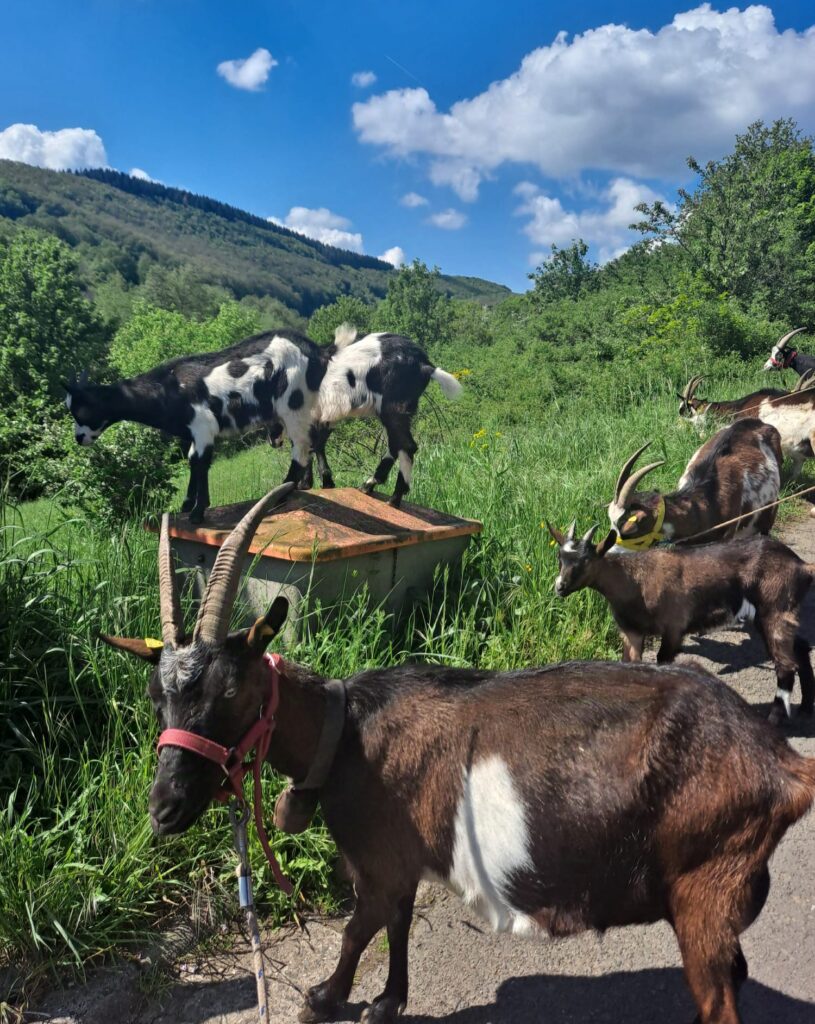 Nach Terminvereinbarung bieten wir ganzjährig Ausflüge mit unseren Ziegen an. (Vorausgesetzt das Wetter spielt mit. Temperaturen über 27°C und Dauerregen mögen unsere Ziegen gar nicht.) Für die Wanderungen haben wir unterschiedliche Strecken zur Auswahl. Die große Tour ist ca. 6km lang, bei den kleineren Strecken kann zwischen 2 und 4 km gewählt werden. Jede der Touren führt steil bergauf und bergab. Daher bitten wir um Verständnis, daß die Wanderungen weder für Kleinkinder, noch für bewegungseingeschränkte Erwachsene geeignet sind.
